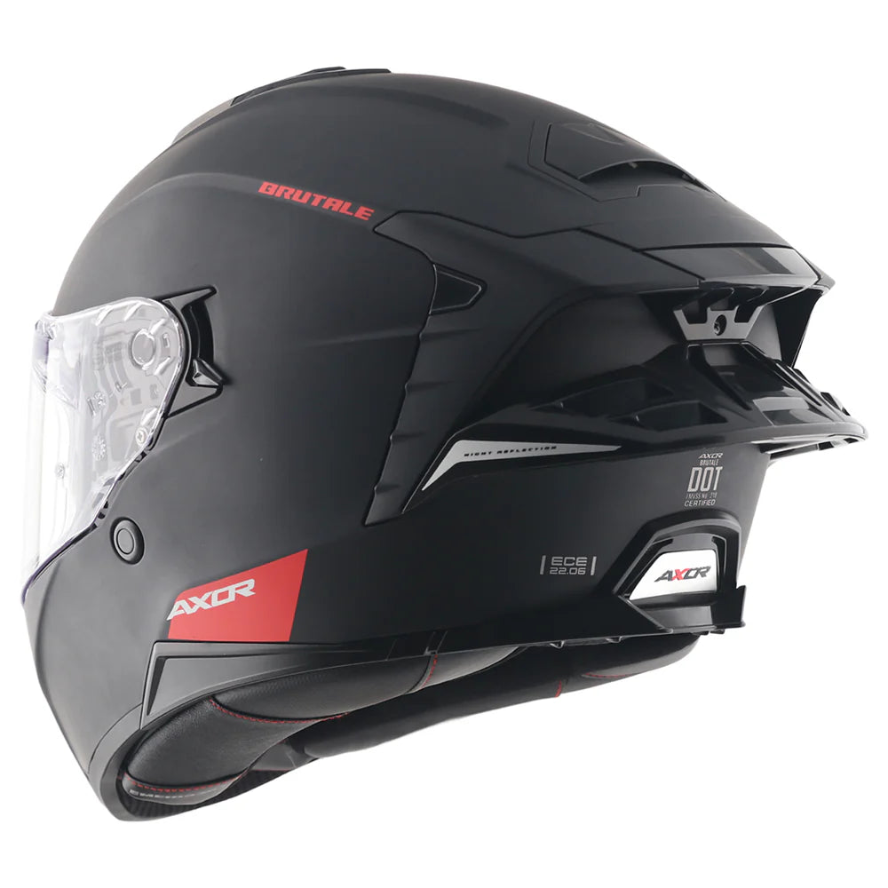 The AXOR Brutale Solid Dull Black Dual Spoiler Helmet is engineered for riders who prefer a clean, understated look without compromising on certified safety and aerodynamic performance. Built on the Brutale platform, this full-face helmet integrates structural durability, airflow management, and modern rider-focused features into a balanced performance package.